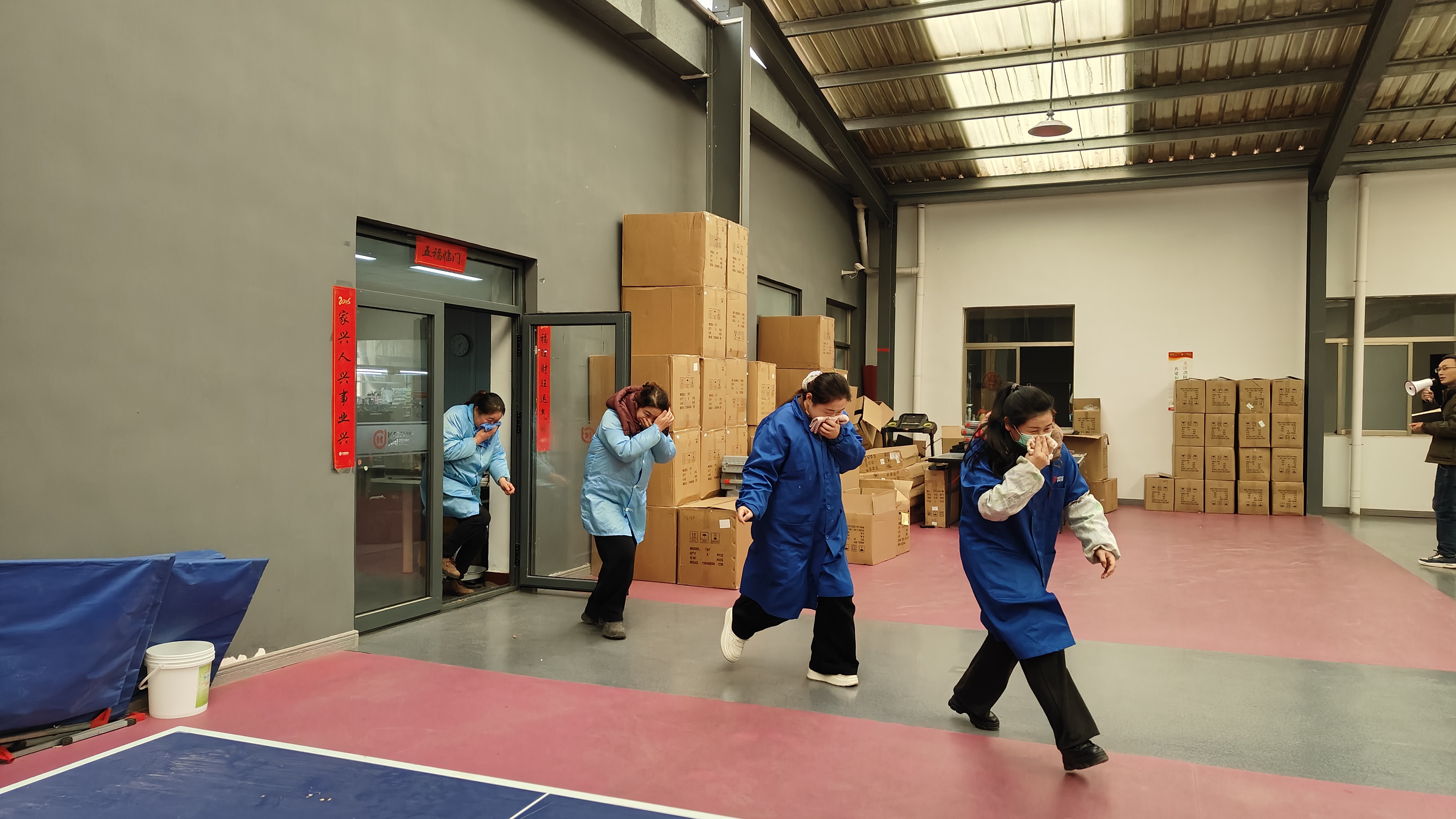 隨著演練指令下達,各部門迅速組織疏散,組織員工彎腰捂鼻、低姿前行,